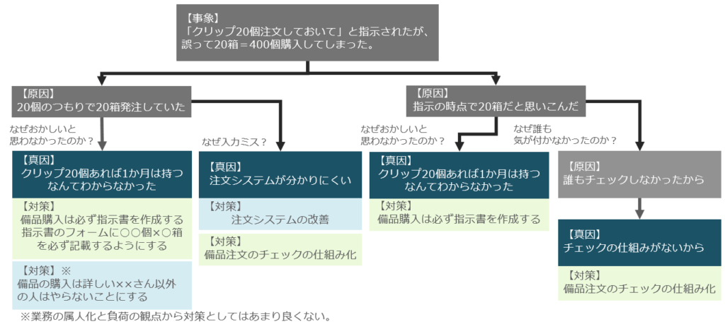 ここでは、原因はふたつ「20個のつもりで20箱発注していた」と「疑いを持たずに20箱発注してしまった」に分けました。前者の「20個のつもりで20箱発注していた」については「20箱も発注すれば大変なことになると知らなかった」「注文システムが分かりにくく、入力ミスをした」の二つを真因として挙げました。(実際には真因にたどり着くまでに2~5ステップを経ています)。後者の「指示の時点で20箱だと思い込んでいた」についても、真因の一つは「20箱も発注すれば大変なことになると知らなかった」としました。前者の真因と同じですね。「誰もチェックしなかったから誰も気が付かなった」はもう少し掘り下げて、チェックの仕組みがないことを真因にしました。